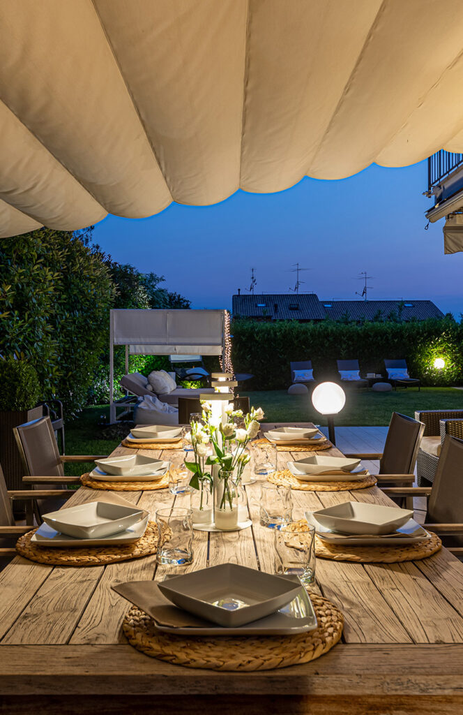 Die Außenterrasse bietet bequem Platz für 10 Personen am Tisch, und zum Schutz vor der Sonne oder bei schlechtem Wetter garantiert eine elegante elektrische Abdeckung die Fortsetzung.